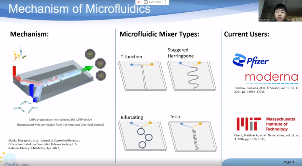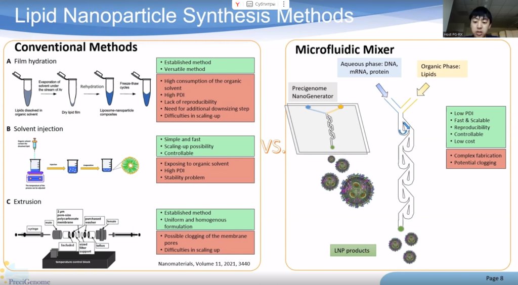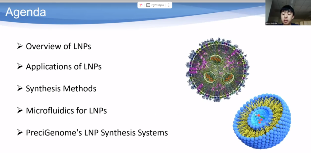 Специалист компании Suzhou PreciGenome Брайан рассказал о новых путях применения липидных наночастиц и методах синтеза на их основе. Автор доклада обсудил историю создания, применение и преимущества липидных наночастиц, их текущее место на рынке и новые технологии синтеза на их основе. Он рассказал о применении таких технологий в медицине, о традиционных и новых путях синтеза наночастиц с использованием систем, выпускаемых компанией.