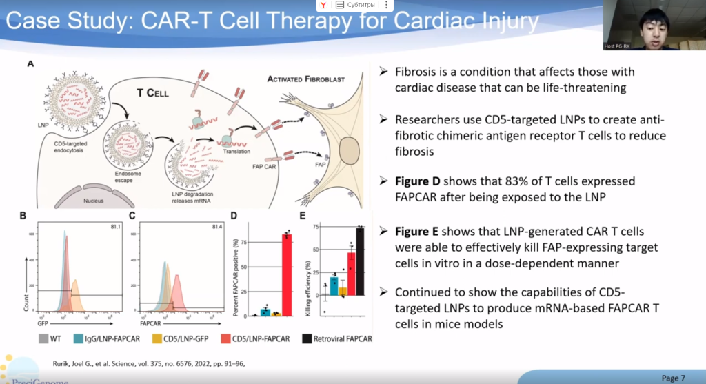 Следующий пример связан с CAR-T клеточной терапией и новым способом применения липидных наночастиц при терапии повреждений сердца, специфичных для фиброза — такие заболевания могут угрожать жизни.