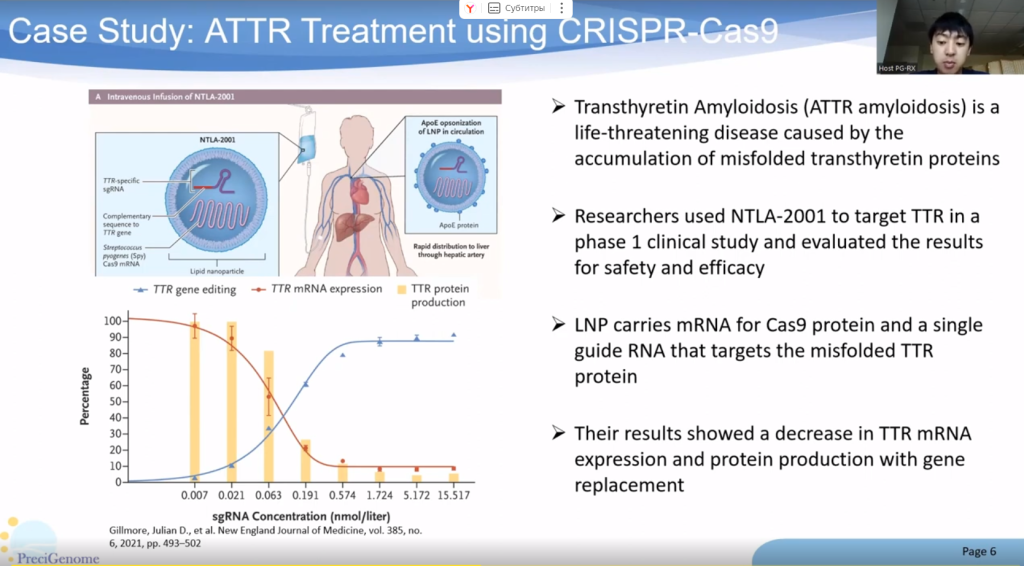 Первый пример — технология CRISPR-CAS 9 для лечения транстиретинового амилоидоза (ATTR-амилоидоза) — жизнеугрожающего заболевания, обусловленного накоплением в периферической нервной системе и внутренних органах деформированного амилоида (неправильно свернутого белка) на основе белка транстиретина (этот белок обеспечивает транспорт ретинола и тироксина).