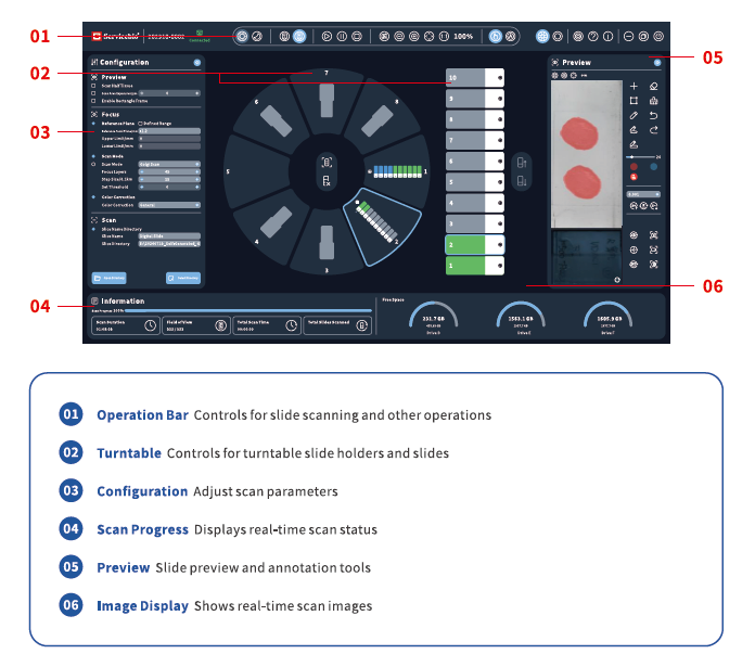 - работа с панорамами препаратов, включая флуоресцентные метки;