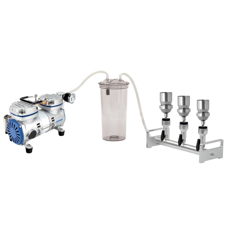 Устройство укомплектовано трехходовыми клапанами, которые выполнены из нержавеющей стали; клапаны дают возможность создать вакуум в соответствии с заданными параметрами и управлять им для каждого держателя отдельно. В системе предусмотрена стерильная вентиляция, это позволяет избежать вторичной контаминации фильтров снизу. Такая система вентилирования позволяет обходиться без водяных ловушек, упрощает чистку и дезинфицирование системы после использования. Есть разъем для подсоединения емкостей для сбора фильтрата.