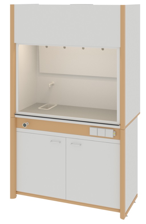 Шкаф вытяжной общего назначения, ширина 124 см, корпус – меламин, столешница – монолитный пластик Trespa, 1 подъемный экран, раковина, тумба, ЛОиП