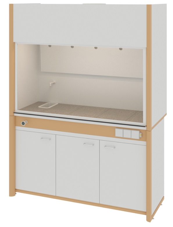 Шкаф вытяжной общего назначения, ширина 150 см, корпус – меламин, столешница – монолитный пластик Trespa, 1 подъемный экран, раковина, тумба, ЛОиП