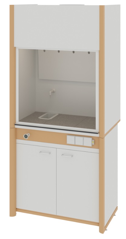 Шкаф вытяжной общего назначения, ширина 94 см, корпус – меламин, столешница – монолитный пластик Trespa, 1 подъемный экран, раковина, тумба, ЛОиП