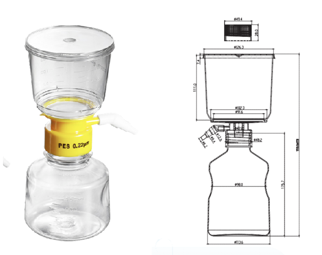 Комплект поставки: фильтр-воронка, встроенный фильтродержатель с мембраной, встроенный боковой вакуумный коннектор и приёмная бутыль.