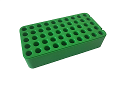 Цельнолитой штатив изготовлен из пластика с лунками, в которые помещаются пробирки/контейнеры, отличается высокой механической прочностью (ударопрочный пластик) и устойчивостью к воздействию химических реагентов. Благодаря своей конструкции штативы легко и прочно штабелируются, обеспечивая экономию пространства при хранении. Особенно подходит для компактного хранения резервных копий образцов. Блочный штатив удобно дезинфицировать, благодаря сквозным отверстиям в каждой лунке. Подлежит автоклавированию.