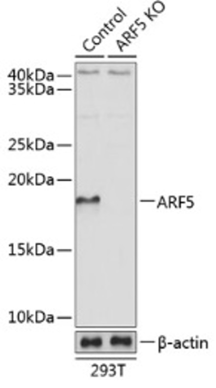 Вестерн-блот-анализ экстрактов нормальных (контрольных) и нокаутных по ARF5 (KO) клеток 293T с использованием антитела к ARF5 (A19986) в разведении 1:1000.